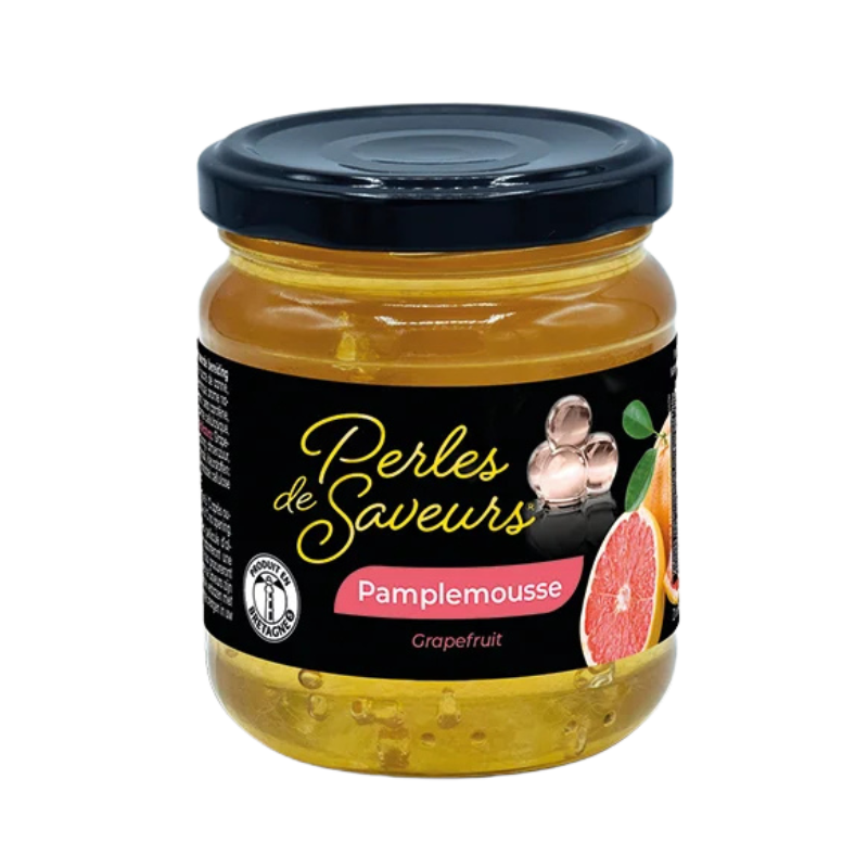 Perles de Saveurs – Grejpfrut su osvežavajuće gastro perlice sa alginatnom ovojnicom i tečnim jezgrom od sočnog grejpa. Svaka perlica donosi harmoničan spoj slatkoće i karakteristične citrusne gorčine, oslobađajući pravu eksploziju ukusa na nepcu.